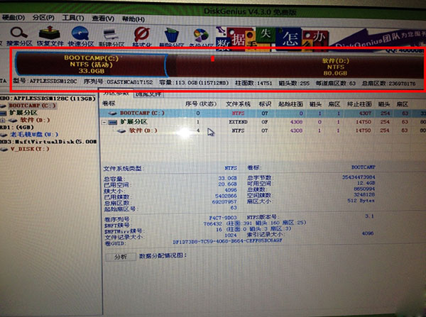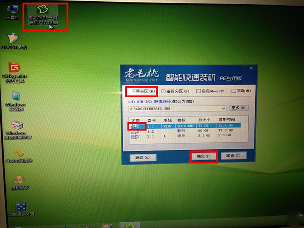 根据你自己的需要对硬盘进行分区,格式建议还是选择NTFS格式,以后会省去很多的麻烦!由于我的是120的AIR,所以我只是分了两个区,一个33,一个80,如果你是500的MACBOOK PRO,那就可以多分两个区了。分好之后,确定,等他跑,跑完了之后关掉分区工具就可以了。然后你现在再打开“我的电脑”,看看是不是按照你选的那样,已经分区成功了,如果没有,重复做上面的动作,一定是哪个地方点错了,不管他提示你什么,选择“是”就对了。 现在你再来“打开老毛桃PE一键装机”,如下图: